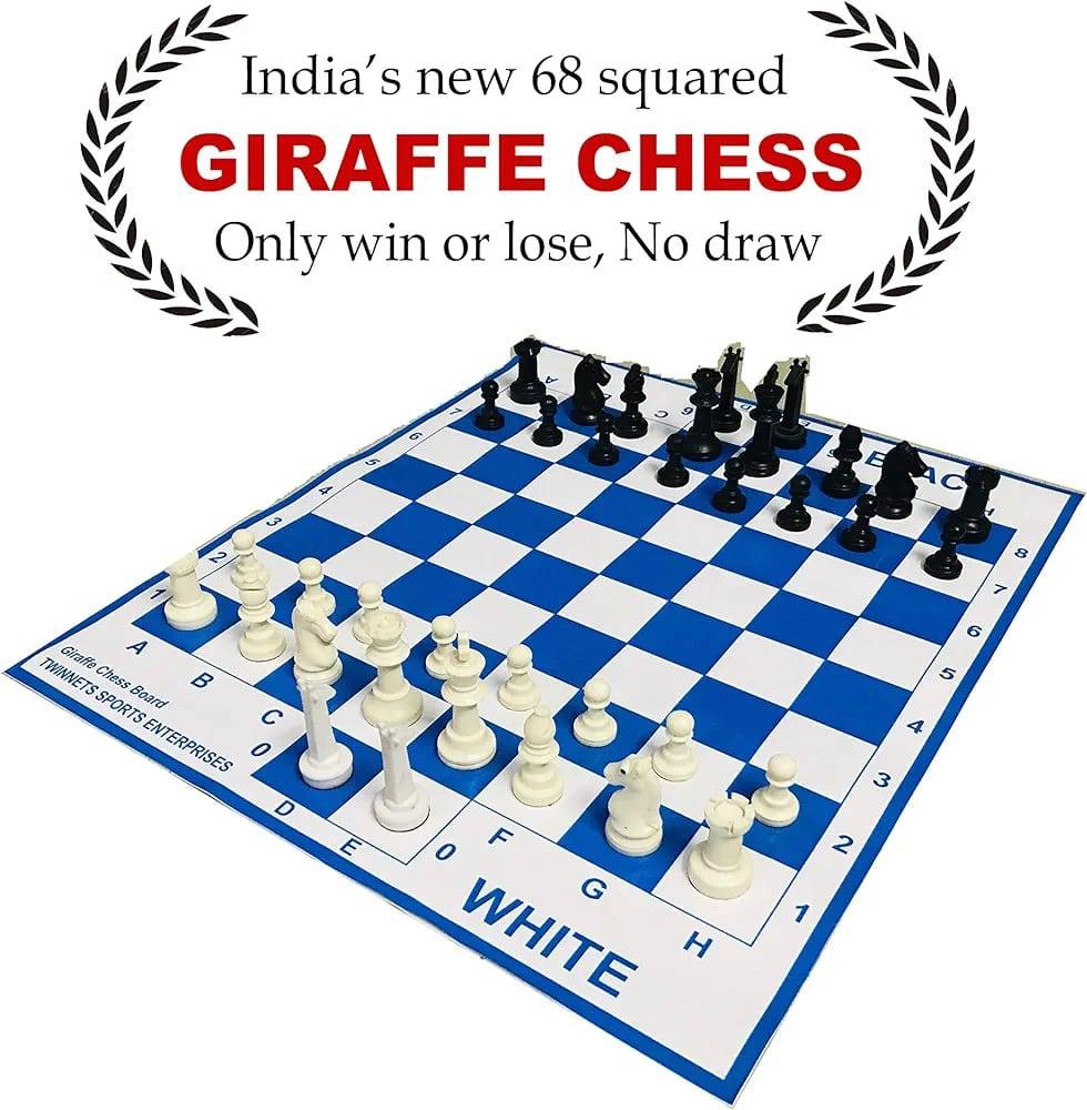 Giraffe Chess is a unique, draw-less and result-oriented 68-square board game, invented in 2012 by Indian school children Nadamala Bhagya Shree and Nadamala Sai Kiran Reddy. In this game, the Giraffe moves by jumping 4 squares in a long L-shape (3+1 or 1+3 squares). Unlike traditional formats, in Giraffe Chess, checkmate and stalemate are also wins, and crowning results in a win as well. (For detailed gameplay, please refer to the Rules page).